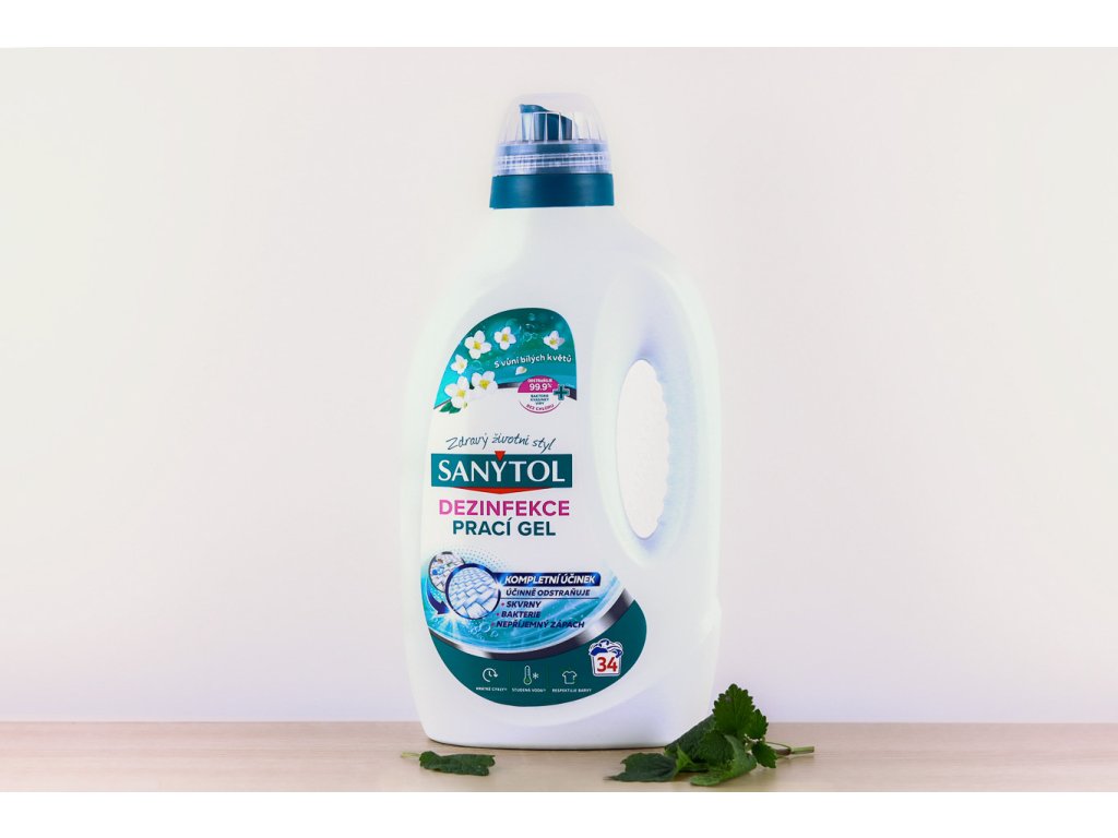 Dezinfekční prací gel s vůní bílých květů, který ničí bakterie a efektivně pere i při nízkých teplotách.
